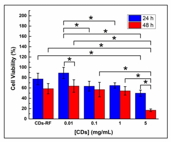 Preliminary tests of cytocompatibility were carried out upon the direct exposure of CDs at varying concentrations and a selected CDs–RF conjugate to MDA-MB 231 cells in culture. Aiming to obtain a comprehensive piece of information, the upper concentrations of CDs and their incubation time with cells were extended to higher values as compared to other publications [42,43,44,45,46] and those explored in the previous characterizations (up to 5 mg/mL and 48 h, respectively). Figure 7 shows the viability of the cultured cells at 24 h and 48 h post-exposure. It can be seen from this figure that the CDs show a dose-dependent cytocompatibility at both time points, which is typical of nanomaterials [46]. Analyzing the samples at 24 h first, it is observed that the CDs at the lowest concentration (0.01 mg/mL) along with the CDs–RF conjugate gave rise to outstanding levels of cell viability (ca. 90% and 80%, respectively) without a significant statistical difference among them (p > 0.05). According to the five-point scale commonly used to categorize biomaterials upon contact with cells, both samples can be considered to be cytocompatible insofar as the viability values they led to (in the range of 70–90%) correspond to a mild reactivity [28,47,48]. Meanwhile, the rest of the CDs samples (0.1–5 mg/mL) were found to produce slightly lower cell viability values in the range of 50–65%, which correspond to a moderate reactivity [47,48]. With respect to the samples incubated for 48 h, on the other hand, both the CDs–RF conjugate and the CDs samples in the range of 0.01–1 mg/mL also reflected a moderate reactivity [47,48], leading to cell viability values of ca. 55–60%. By contrast, the most concentrated CDs sample (5 mg/mL) rendered a cell viability of ca. 17%, which corresponds to a severe reactivity [47,48]. As already mentioned, it is worth noting that the experimental procedure here followed entailed the incubation of the samples for the whole length of the experiments (24 h and 48 h), which might have contributed to the moderate-to-severe reactivity displayed by the concentrated sample at 48 h. Other publications in the field have considered the exchange of cell culture medium at short periods after the administration of the respective nanomaterials [43,44,45,46], which might help to reduce probable scenarios of cytotoxicity. Whatever the case, it is remarkable that the CDs herein produced proved to be cytocompatible at the concentration regime at which they are used as sensors of RF. Moreover, RF is not expected to confer any cytotoxicity on the CDs–RF conjugate given that it has been demonstrated to be totally cytocompatible at concentrations up to 5 mM (a concentration ca. two orders of magnitude higher than the one here studied) [49]. In addition to the mild synthesis process, herein optimized, the observed cytocompatibility of the CDs and the CDs–RF conjugate can certainly be related to the natural occurrence of RF in the organism and the proper solubility of both (CDs and RF) in PBS. The outstanding cytocompatibility of the developed platform under its working conditions, even after a long incubation time with cells, makes us envisage it as highly attractive for other applications in the biological field, such as intracellular sensing and staining for live cell microscopy [50]. In particular, the CDs–RF probe can be tested to study the transport and intracellular localization of RF, similar to other probes based on the FRET process [51].