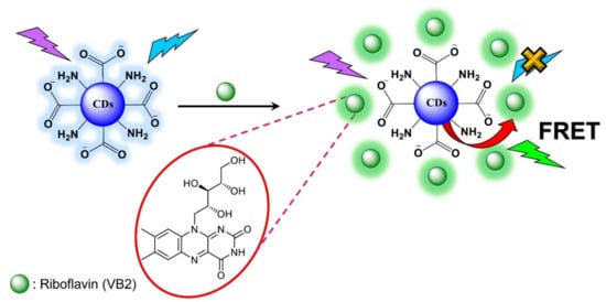 CDs are a type of carbon nanomaterials with sizes less than 10 nm [2]. They have become very popular due to their enhanced photoluminescent properties and excellent photostability. They show a quantum yield (QY) and photochemical stability similar to those of the well-known and commercialized colloidal nanocrystalline semiconductors quantum dots (QDs). Additionally, they are soluble in water, their fluorescence emissions can be modulated with the excitation wavelength, and they have the advantage of being non-toxic materials according to in vivo toxicity tests [1,2,3]. Due to their excellent optical properties, high photostability, simple manufacturing process, low cost, and biocompatibility, CDs have received a great deal of attention for their potential application as sensors and as nanoplatforms for diagnosis and therapy. In particular, their application in Förster resonant energy transfer (FRET)-based systems are of great interest and the subject of exploration. In the FRET process, a non-radiative energy transfer occurs between the donor and the acceptor through dipole–dipole interactions. In FRET systems that involve CDs or other nanoparticles, such as quantum dots (QDs), the interactions are based on the point-dipole model [4,5]. For an energy transfer to occur, the donor and the acceptor must be at a favorable distance (less than 10 nm) [6], and the donor’s fluorescence emission spectrum must overlap the acceptor’s absorption spectrum. This technique is commonly used to determine the distance between two molecules and their specific location, whereas other methods are not sufficiently accurate as compared with FRET. In particular, the use of CDs in FRET-based platforms has great potential in different areas. CDs offer new and versatile opportunities, as they are easily functionalized, facilitate the design of more efficient FRET systems, and provide better analytical characteristics, such as lower detection limits in the quantitative determination of species. In contrast to conventional fluorescent materials such as organic dyes, the peak emission of CDs can easily be controlled over a wide wavelength range, which makes them suitable for detecting various biomolecules, including vitamins. On the other hand, the surface structure of CDs can easily be designed to show a strong attraction to specific molecules, which allows for a very close distance between the CDs and the acceptors [7]. These excellent properties satisfy the requirements of a FRET system and make CDs excellent potential donors with high selectivity and sensitivity.