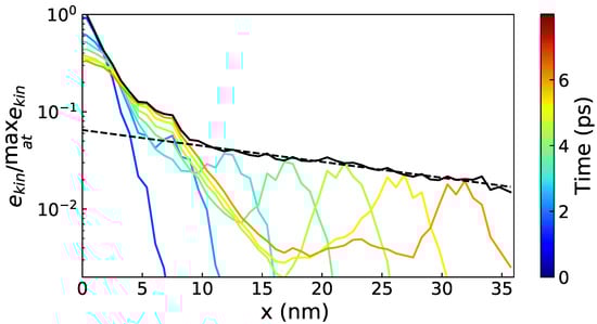 The MFPs of the propagating modes are estimated from the decay rate of the envelope of the WP as a function of the distance to the excited slice. The envelope of the WP is defined as the maximum value of the kinetic energy at each point along the propagation path (see Figure 1). The envelope of a WP traveling ballistically follows a Beer–Lambert law (exponential decrease) [42]. Due to the presence of the NIs, the envelope may contain plateaus and sharp decreases; thus, to get a meaningful value of the exponential decay fit, the portion on which the least square fit is made has to be chosen appropriately. Moreover, as shown in Figure 1, in the vicinity of the excited slice a diffusive part is visible; this part is not included in the MFP computation. The propagation takes place in both x positive and x negative directions, and the final value of the decay rate is the average of the two.