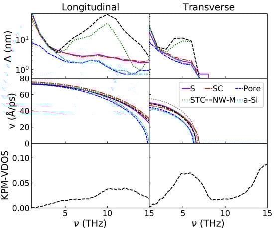 The group velocities for the longitudinal and transverse polarizations are displayed in the second row of Figure 3. All configurations share a very similar group velocity. This is especially true for the longitudinal polarization at low frequencies (below 5 THz). At higher frequencies, the group velocities for the amorphous and porous configurations are lower than the group velocities of the others. The v values of the configurations containing NIs are very similar to those of c-Si. For the transverse polarization, there is also a group velocity difference, although spanning over the whole spectrum. For this polarization, the v of the nanocomposites containing NIs is in between those of c-Si and a-Si. Finally, the transverse polarization has a nil velocity for frequencies higher than 7 THz.