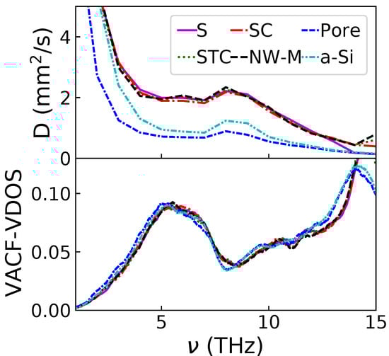 The different terms contributing to are shown in Figure 4. The top panel corresponds to the diffusivity computed with Equation (8). Two main observations can be made: firstly, all the configurations containing a crystalline phase share a very similar diffusivity across the whole spectrum; secondly, only the porous configuration induces a reduction of diffusivity with respect to the amorphous sample. The addition of NIs increases the diffusivity. Additionally, a small peak at 8 THz is visible for all cases; this peak corresponds to the end of the transverse phonon dispersion curve and was already observed by Allen and Feldman [6]. The VDOS computed through the VACF for the different configurations are displayed in the bottom panel of Figure 4. All the VDOS are very similar up to 14 THz. At higher frequencies, the configurations containing NIs and the others show differences. The VDOS of a-Si starts to decrease from 14 THz, while the others continue to increase. However, this difference has little effect on the given that the diffusivity is very low at those frequencies.