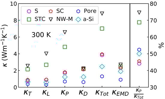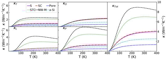 The different terms displayed in Figure 3 and Figure 4 are used to compute and . The results for temperatures between 10 and 400 K are displayed in Figure 5. The first column contains the transverse and longitudinal propagative contribution. It confirms that the structural percolation induces a marked increase of the propagative contribution; the STC and NW-M have a larger and . However, for the diffusive contribution in the top row of the central column, no distinction between the configurations containing NIs can be made. Only the pores seem to decrease the diffusive contribution below amorphous values. The propagative contribution, for both polarizations, increases with the degree of interconnection. When looking at the propagative contribution as a function of the temperature, it appears that increases at higher temperature than . This is linked to the MFP peak at 10 THz and to that limits the impact of high frequencies at low temperature. This important high frequency contribution also results in a maximum of around 200 K for the NW-M. This is due to the empirically added phonon–phonon term (Equation (10)) that reduces the contribution of high frequency phonons as the temperature rises. The different contributions (propagative and diffusive) can be compared in the central panel. The diffusive and propagative contributions for the non-percolating configurations have similar values at 300 K.