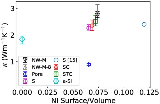 The thermal conductivity can also be estimated from the Green–Kubo relation (Equation (2)). The results at 300 K as a function of the surface to volume ratio of the NIs are displayed in Figure 7. A clear trend appears for the configurations containing NIs; the thermal conductivity increases with the surface to volume ratio. Moreover, the thermal conductivity is very close to the one of Tlili et al. [15] for a nanocomposite with smaller NIs representing the same volume fraction but twice the surface to volume ratio. This hints that the effect of the interconnection/structural percolation is stronger than the effect of an increased scattering surface. It is also noticeable that all the NIs of this study are regrouped in the center of the graph with ratios between 6.5 × 10−2 and 7.5 × 10−2. The are also very close, with intersecting error bars. In the end, only the NW-M really stands out with a increased by 20% compared to the spherical NI. Finally, the thermal conductivity for a cubic supercell of eight NW-M (in gray) is very close to the of the single NW-M. This absence of variation of the thermal conductivity shows that does not depend on the number of NI simulated. The EMD methodology is not strongly size dependent [56,57].