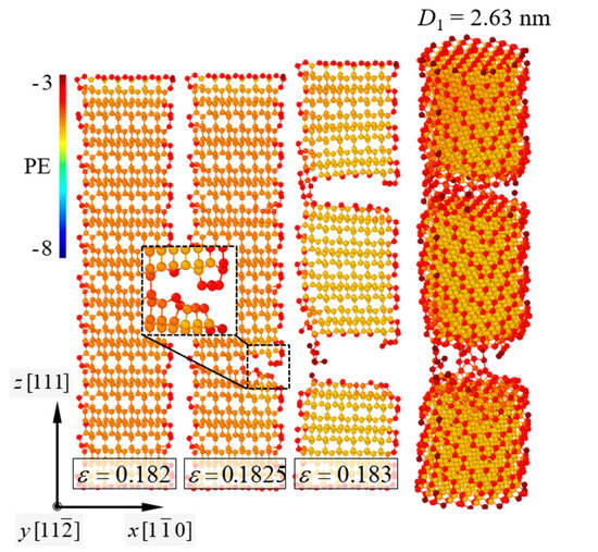 As is known, the fracture behavior of nanowires depends on the surface-to-volume ratio [16]. Stress distribution on the surface plays an important role in the fracture behavior of nanowires with smaller dimensions [46]. Rudd and Lee [47] have reported that the level of surface stress can influence the local structural changes of SiNWs and determine their global mechanical properties. In this study, we found that the CNT shell considerably affected the BDT of the SiNWs. Computational results were achieved for the SiNWs with diameters in the range of 1.89–6.71 nm. The failure of the [110]-oriented SiNWs encapsulated with the CNTs involved slip deformations along the (111) crystallographic plane (Figure 10). Compared to the pure [110]-oriented SiNWs, the BDT of the [110]-oriented SiNWs was not observed in the core/shell nanocomposite models. This indicates that the atomic-order interfacial interaction between the SiNWs and the CNTs significantly changes the surface elasticity of the SiNWs. The CNT shell of the core/shell nanocomposites might generate shear components that sufficiently induce plastic events in the [110]-oriented SiNWs.