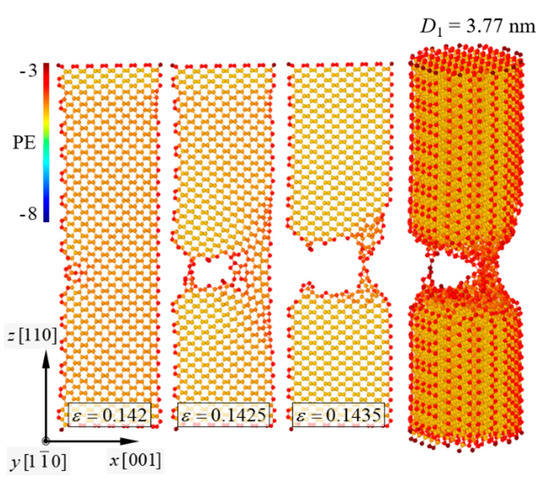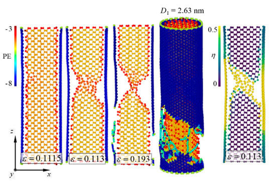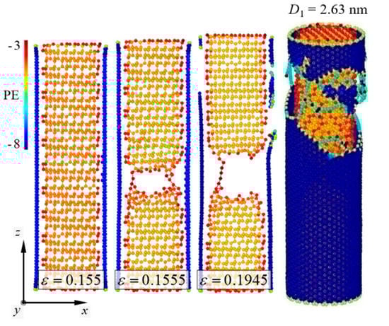 Fracture behaviors of the pure [111]-oriented SiNW and Model-1 are shown in Figure 2 and Figure 3, respectively, and the diameter of the SiNW is 2.63 nm. The color indicates the atomic potential energy level. Cohesive energies of Si with a diamond cubic structure and CNTs were −4.63 and −7.40 eV, respectively (Table 1). For the [111]-oriented SiNW, nucleation of a crack along the (111) crystallographic plane was observed at εz = 0.1825, and brittle failure occurred at εz = 0.183. The tensile stress and strain curves (Figure 4) exhibited a failure strength of 14.3 GPa for the [111]-oriented SiNW. For Model-1, the SiNW brittle failure occurred at εz = 0.1555. The atomic bonds of the CNT shell broke at εz = 0.1945. SiNW failure in the case of Model-1 was noticed when the tensile stress reached 44.5 GPa.