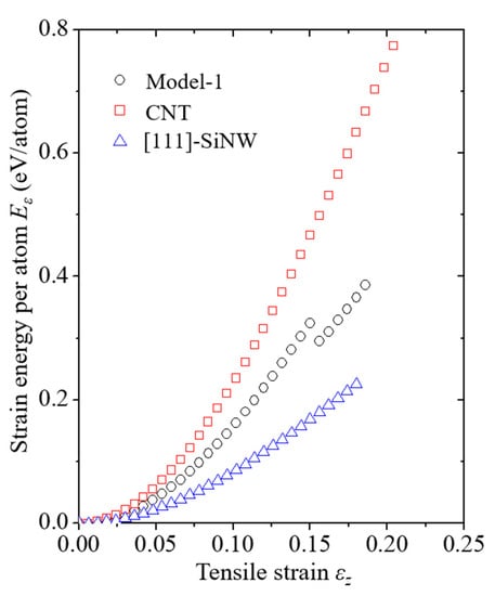 Average strain energy and strain curves of Model-1, CNTs, and [111]-oriented SiNWs. The LTI of the CNTs and the diameter of SiNWs are (24,24) and 2.63 nm, respectively. SiNW failure for Model-1 was noticed when the applied strain ε exceeded 0.155.