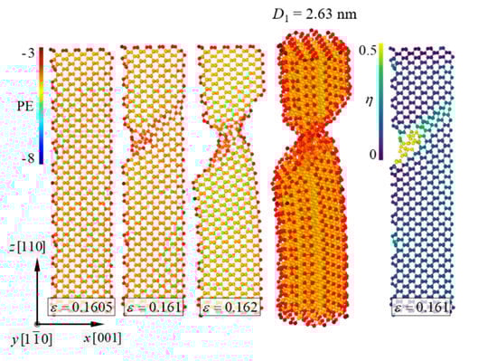 Ductile failure behavior of the [110]-oriented SiNWs with D1 = 2.63 nm. Slip deformation occurred along the (111) crystallographic plane. η denotes the level of the atomic shear invariant [45].