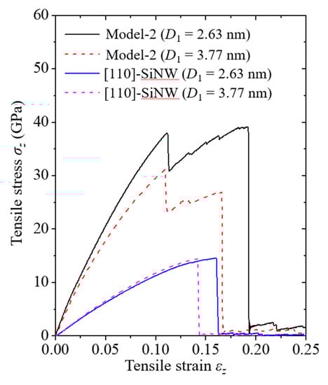 Stress and strain curves of Model-2 and the [110]-oriented SiNWs.