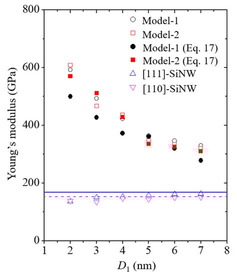 Size dependence of the Young’s moduli of the nanocomposites and pure SiNWs. Effective Young’s moduli of nanocomposites were acquired from the asymptotic solution of Equation (17). Solid blue and dashed magenta lines indicate the bulk properties of the Si single crystals with the [111] and [110] crystallographic systems, respectively, obtained from the previous study reported by Kang and Cai [19].
