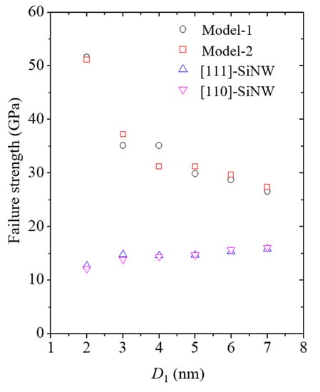 Failure strengths of the SiNWs and the core/shell nanocomposites with different SiNW diameters are shown in Figure 12. The failure strengths of the nanocomposite models were recorded whenever the Si failure was discerned. The failure strength of the SiNWs encapsulated with CNTs was significantly higher than that of the pure SiNWs. Moreover, the failure strength of the nanocomposite models increased with a decrease in the SiNW diameter owing to the enhanced volume contribution of the CNTs. A corresponding trend was also found for the size-dependent (Table 3). Theoretical fracture toughness was calculated to be based on the Griffith fracture criterion [50]. for the nanocomposite models was substantially higher than that for the pure SiNWs because of the considerable CNT shell edge energy. The CNT shell edge energy has been experimentally reported to be approximately 8 J/m2 [51].