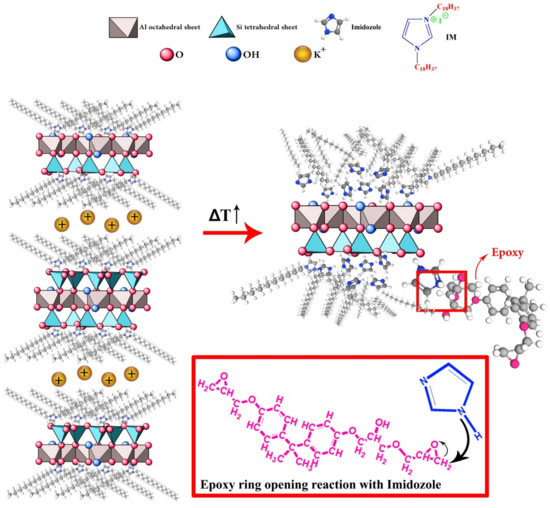 - Seidi, F.; Jouyandeh, M.; Akbari, V.; Paran, S.M.R.; Livi, S.; Ducos, F.; Vahabi, H.; Ganjali, M.R.; Saeb, M.R. Super-crosslinked ionic liquid-intercalated montmorillonite/epoxy nanocomposites: Cure kinetics, viscoelastic behavior and thermal degradation mechanism. Polym. Eng. Sci. 2020, 60, 1940–1957. [Google Scholar] [CrossRef]