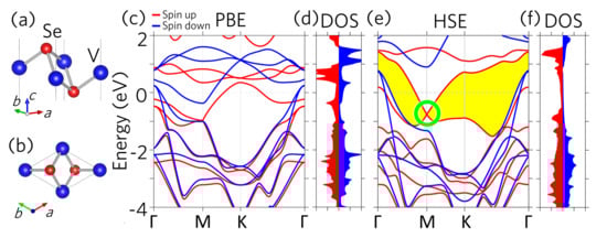 Figure 1a,b show the lattice structure of monolayer. Similar to other transition metal dichalcogenides in the phase, the transition metal atom, vanadium (V), locates at the center plane sandwiched between two chalcogen anions, selenium (Se). By adopting the experimental lattice constant 3.36 Å [14,30], the optimized V–Se bond length is 2.49 Å with the corresponding interlayer distance being 1.56 Å.