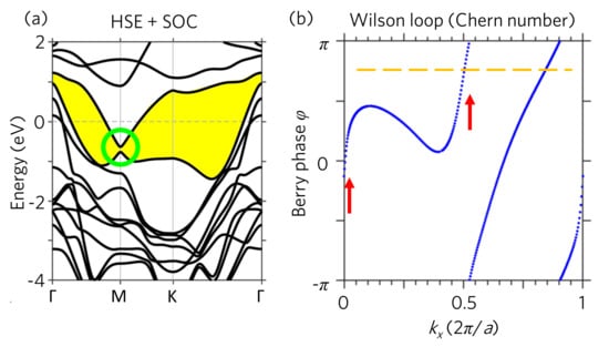 Figure 1e,f show the HSE band structures and DOS, respectively. As expected, the band gaps are significantly enhanced by the HSE functional, especially around the Fermi level. In particular, there opens up a continuous band gap, as shown in the yellow region (Figure 1e). Accordingly, the DOS peaks of V orbitals are pushed away from the Fermi level, resulting in the enhanced magnetic moment of 1.1 per V ion. A remarkable emerging feature is the band crossing at the M point by two spin up single bands at the energy of eV as highlighted by the green circle in Figure 1c. Some of the previous works have named such crossings in 2D systems as Weyl points [36,37,38], even though the Weyl point was originally defined in three-dimensional materials [39]. In this work, following previous works, we hereafter call this band crossing as the Weyl point. Our analysis as discussed below also shows band inversions around the Weyl point, implying that a topological phase occur in this TMD monolayer, similar to the two bands crossing at K points in graphene [2] and Xene monolayer [40].