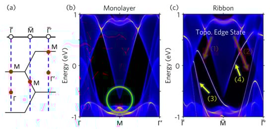 To show the topological edge states on the (010) boundary of the ribbon, we perform the semi-infinite Green function calculations. Figure 3a illustrates the relation between the 2D and 1D BZ of monolayer and (010) ribbon, respectively. The M point in the 2D BZ projects to the point of the (010) 1D BZ. The and M points project to the point of the (010) 1D BZ. The band structure of the 2D monolayer is depicted in Figure 3b. The green circle in Figure 3b highlight the SOC band gap at the M point corresponding to that shown in Figure 2a. In comparison with the band structure of the 1D (010) ribbon shown in Figure 3c, one can clearly identify four edge states. Among them, two edge states indicated by red arrows (1) and (2) connecting the conduction and valence bands are topologically non-trivial. Whereas the other two edge states indicated by yellow arrows (3) and (4) are topologically trivial. The edge state (3), which is coincident with the 2D bulk band edge as compared with Figure 3b, can be identified as the edge resonance state. Although the edge state (4) connecting the conduction band at to the conduction band at is thus a topologically trivial edge state. Our Green-function simulations present two topological edge states in good consistency with our Wilson loop simulations discussed in the last paragraph.