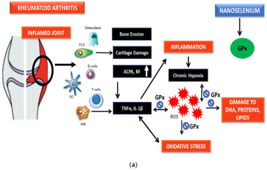 In the past, lowered serum concentration of trace micronutrients has been demonstrated as a frequent event in autoimmune diseases [23]. Epidemiological reports proved that a low Se status can be a risk factor for RA, indicating the significance of antioxidants in controlling the maintenance and progression of the disease [24,25,26,27,28,29,30,31,32,33]. Some other recent studies have also supported the relevance of Se status in RA [34,35,36]. Moreover, Na Yu et al. also reported the relation between serum Se levels and RA through a meta-analysis approach. In this study, they reported a meta-analysis from 14 case control studies that included 716 participants and showed significant association between RA and low serum Se concentration [37]. Given that, it has been reported since long that observed serum Se amount is less in RA patients than in controls [38]. Francisco et al. also discussed the relevance of Se status in detail in context to RA [39]. Nonetheless, though it is not clear if Se deficiency is a cause or outcome of the incident of the disorder, the decreased levels can result in the progression of the disease since they have been linked to the creation of ROS and related inflammatory states [40].