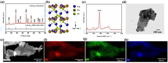 Figure 1e–h, shows the uniform distribution of Cu, Fe, and Se elements within the CuFeSe