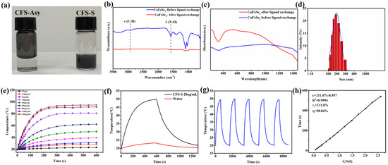 To explore the photothermal effect of CFS-S, a series of CFS-S aqueous solutions (250 µL) with concentrations from 2.5 µg/mL to 160 µg/mL were irradiated with an 808 nm NIR laser with an output power density of 1 W/cm