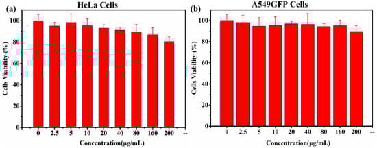 The in vitro cytotoxicity of CFS-S was assessed using the Cell Counting Kit-8 (CCK-8), GLPBIO Technology Inc. (Montclair, CA, USA). in HeLa and A549GFP cells. Cells were seeded into 96 well plates (8000 cells/well) in Ham’s F-12K medium at 37 °C and in a 5% CO2 atmosphere for 24 h. Then, 25 μL of CFS-S aqueous dispersion at different concentrations (0, 2.5, 5, 10, 20, 40, 80, 160, 200 μg/mL) was added into each well, which contained 225 μL fresh medium. After an additional 24 h of incubation at 37 °C, the culture CFS-S-containing medium was replaced with 10 μL CCK-8 in 100 μL fresh medium, and each well absorbance was measured (450 nm) in five replicates for each concentration.