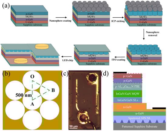 (a) Photolithography of SiO2 nanospheres and fabrication of near ultraviolet LED devices; (b) Nanopore structure between p-GaN nanorods after ICP etching; (c) LED chip fabricated under optical microscope; (d) Epitaxial structure of LED devices.