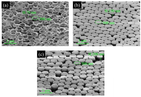 Figure 4 shows the SEM pictures of GaN nanopillars with three different etching depths. A vertically arranged GaN nanopillar structure can be obtained after ICP etching under a single-layer SiO2 nanosphere array with a diameter of 500 nm coated on a fully structured sample. As shown in Figure 4a, a 70 nm nanocolumn structure is prepared by ICP etching. After the nanosphere mask is etched, some defects, such as voids, appear on the surface of epitaxial wafers due to the Brownian motion and capillary forces in the coating repeatability experiment. The overall surface pattern is still closely arranged in the cylinder, and a large number of nanogroove structures appear between the cylinders. The smallest groove is only tens of nanometers.