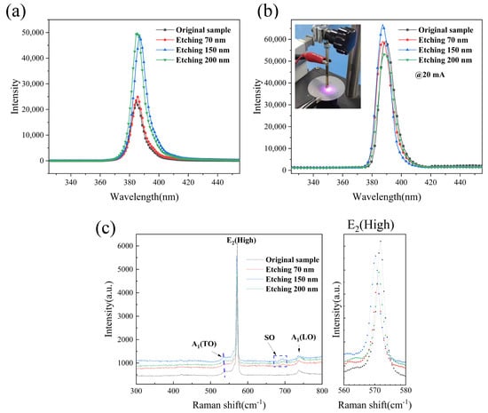 Figure 5b shows the electroluminescence (EL) spectra of the p-GaN flat plates with etching depths of 70 nm, 150 nm and 200 nm. It can be seen from the Figure 5b that the four groups of samples have an electroluminescence peak near 390 nm and that the peaks are at 389.81 nm, 388.31 nm, 387.95 nm and 389.62 nm. In Figure 5b, the wavelengths of E-70 nm, and E-150 nm samples are significantly lower than those of the original and E-200 nm samples. The peak position of the EL compared with the PL peak position is redshifted (3~5 nm) when the 20 mA current is in the forward direction. Due to the strong piezoelectric polarization, a huge macroscopic electric field(>1 MV/cm) exists in the InGaN/GaN quantum well []. This huge electric field in the quantum well induces a increment in transition energy due to the quantum confined QCSEs [].