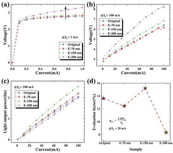 We select four kinds of LED chips with 390 nm wavelengths and test their electrical performance. Figure 6a shows the turn-on voltages of four kinds of LED chips under a 1 mA current; this parameter increases with increasing p-layer etching depth. The maximum increase occurs in the E-200 nm sample because the etching depth of 200 nm basically penetrates the p-type layer, and hole injection into the active region is affected, which significantly increases the turn-on voltage. Figure 6b shows the working voltages of four kinds of LED chips under normal working current. Increasing the etching depth in a proper range does not lead to a significant increase in the working voltage. Figure 6c shows the optical output power diagrams of four kinds of LED chips. The optical output power of the E-70 nm and E-150 nm samples is significantly improved. This is because the p-GaN nanopillar formed by etching on the top of the epitaxial wafer reduces the total reflection of light on the light-emitting surface of GaN, thus improving the light output power (LOP). It is surprising that the optical output power of the E-200 nm sample is lower than that of the original sample at the same current; this may be due to the influence of p-type carrier injection into the active region after the etched structure penetrates the p-type GaN layer, which reduces the radiation recombination efficiency in the active region.