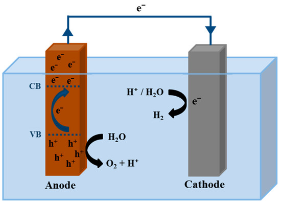 A PEC cell consists of an anode and a cathode that are immersed in a conductive electrolyte and also connected by an external circuit [6,8,9]. One or both electrodes need to be photoactive materials to photogenerate electron-hole pairs when illuminated [10]. As a basic fundamental of the PEC cell, when the photoanode is illuminated by solar light, electron-hole pairs are photogenerated, and a charge separation is produced. Then, the holes go to the anode/electrolyte interface to oxidize the water to O2 according to Equation (1) [11].
