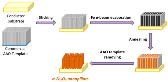 After the electron beam evaporation, samples were annealed in a quartz tube furnace (Carbolite, Type MTF12/50/250, Sheffield, Reino Unido) with a temperature controller (Eurotherm 91e, Worthing, Reino Unido) for 1 h at 500 °C with a 2.5 L·min−1 air flow. Once the samples were cooled down, part of the templates were separated from the substrates due to the temperature difference. However, the samples were immersed in 1 M NaOH (Sigma Aldrich, Merck 100.5%) solution for 2 h at room temperature, to completely dissolve the AAO templates in order to have self-standing nanopillars. The experimental procedure carried out to synthesize the α-Fe2O3 nanopillars is depicted in Figure 2.