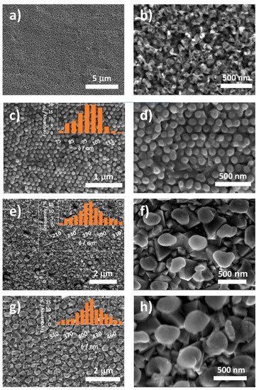 During this study were prepared nanopillars with diameters from 90 to 400 nm. Figure 3c,d shows nanopillars formed with AAO templates of φ90 nm, and an average diameter of φ95 ± 12 nm was obtained for the nanopillars. These nanopillars are completely homogeneous on the FTO surface, which is beneficial for the photoelectrochemical applications. When an AAO template of 260 nm in diameter was used, nanopillars with φ265 ± 33 nm were obtained (Figure 3e,f). Finally, when AAO templates 400 nm were chosen, nanopillars with an average diameter of φ409 ± 51 nm were formed (Figure 3g,h). In the three cases, FTO crystals can be appreciated underneath the nanopillars because of the magnification of the SEM images (see Figure 3d,f,h). These crystals can be more noticed in the samples with nanopillars having diameters of 260 and 400 nm, since the physical space between nanopillars are higher than those of the nanopillars with lower diameter (90 nm).