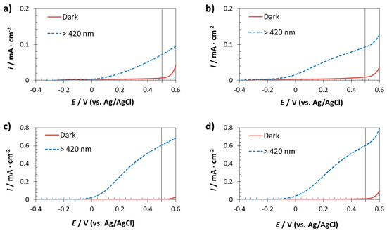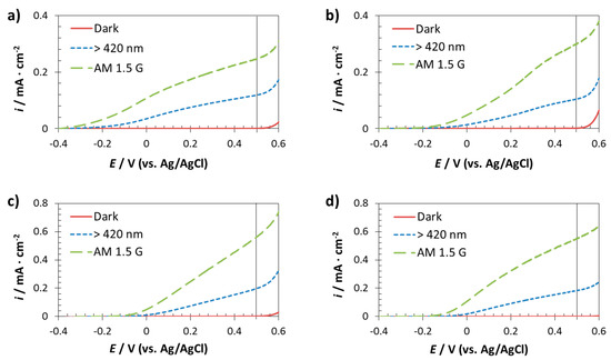 Current/photocurrent density versus applied potential curves of the photoanodes fabricated on FTO substrates: compact layer (a) and using different AAO templates: φ90 nm (b), φ260 nm (c) and φ400 nm (d). Dark, visible light (λ > 420 nm) and solar AM 1.5 G (55 mW·cm−2) illumination conditions were applied.