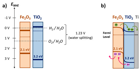 Energy bands positions of Fe2O3 and TiO2 semiconductors when isolated (a) and when they are connected (b).