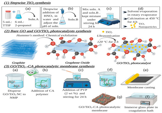 Synthesis schemes (1) TiO2 synthesis (2) Bare GO and GO/TiO2 synthesis (3) GO/TiO2-CA photocatalytic membrane synthesis.