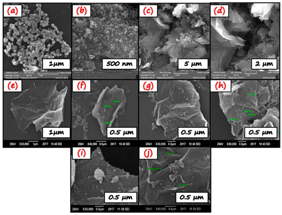 SEM observed the morphology of samples with different scales. Figure 4a,b depict the morphology of TiO2, which is found to be spherical agglomerated nanoparticles. Figure 4c,d represent the SEM images of graphene oxide. The SEM images indicate that graphene oxide contains aggregated crumpled multilayer sheets because of the introduction of oxidizing functional groups. The GO sheets have irregular and folded structures formed as a result of stacking. This morphology is beneficial to the growth of TiO2. As shown in Figure 4e–j, numerous TiO2 NPs are uniformly and evenly distributed/decorated over the GO sheets. As the GO content increases, from NC-1 to NC-3, a slight change in morphology was observed. As the GO layers are curled in NC-1 while in NC-3, they constitute less stacking and have few layers. The change in morphology from curled to loose and less stacking may be attributed to the introduction of GO, which hampers the aggregation of TiO2 nanoparticles, especially in NC-3. Thereby, the surface area is increased. Herein, the spherical morphology of TiO2 nanoparticles integrating with loose GO sheets designs the surface properties and surface area and tunes the electronic structure, i.e., improves the photocatalytic activity due to the more active visible light spectrum [48]. The TiO2 exhibit dispersed morphology in the case of all nano-composites. The well-distributed TiO2 on the graphene oxide (GO) planes is evident in the successful loading of TiO2 on GO planes. This interaction between TiO2 nanoparticles and GO can promote charge transfer between them. Thus, they play a vital role in the enhanced photocatalytic response. All the SEM images show that the nanoparticles have an average particle size below 40 nm, spherical, and evenly distributed.