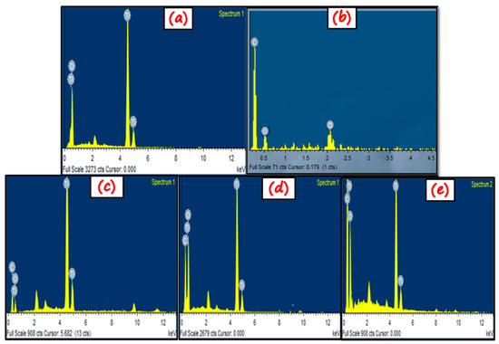 EDX is utilized to find the elemental composition and purity of the sample. The presence of every element in the sample is confirmed by its specific peak in the respective graph (Figure 5). The EDX results of TiO2 (Figure 5a) clearly show the signals for titanium and oxygen. Figure 5b shows the signals of oxygen and carbon, which represents the GO sample. However, in nano-composites Figure 5c,d, the amount of titanium decreases while carbon and oxygen content increases from NC-1 to NC-3. This might be attributed to the increase in GO content from NC-1 to NC-3.
