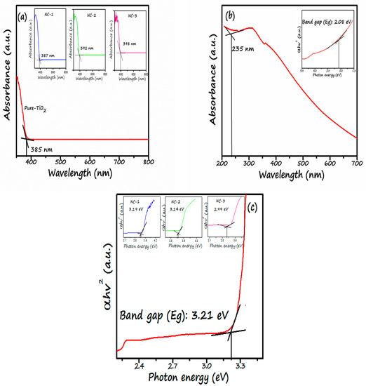 The bandgap of all the samples was calculated using the tauc equation: αhv = A(hv − Eg)2 [24]. By plotting graph between (αhv)2 against hv. The band gap value of all the photocatalysts are depicted in Figure 6 and Table 1. Figure 6a insets show zoom-in plots for the nano-composites, which demonstrate that the absorption edge of titania has shifted towards the lower region. This means a redshift has been observed, viz. 387 nm, 392 nm, 398 nm, respectively, therefore extending the absorption of light in the visible region. The figure illustrates very little shift in the absorption edge. This might be credited to the increase of GO content in a low amount (only 0.5%). This shift in the extended absorption visible region is due to the formation of Ti-O-C chemical bonding, which is supplementarily verified from the FT-IR spectra (Figure 7b–d). The GO has a significant effect on the bandgap of TiO2. TiO2 band gap is decreased viz. 3.19, 3.14 and, 2.99 for NC-1, NC-2, and, NC-3 respectively, with the increase in GO content as depicted in Figure 6c.