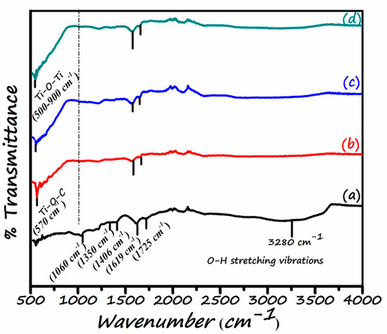 FT-IR spectroscopy is carried out for the understanding of bonding characteristics of functionalities forming photocatalyst. Figure 7 demonstrates the FT-IR spectra of all the samples. Various strong absorption bands of oxygenated functional groups are present in the spectrum of graphene oxide Figure 7a. The characteristic peaks appeared at 1060 cm−1, 1350 cm−1, 1406 cm−1, 1619 cm−1, 1725 cm−1, and 3407 cm−1 correspond to alkoxy/alkoxide C–O, the stretching vibration of epoxy/ether (C–O–C), carboxy O–H, aromatic skeletal vibration of C=C and H–O–H bend, the carboxy/carbonyl (C=O) stretching vibration and O–H stretching vibrations of the C–OH groups and H2O respectively [39,40]. The FT-IR spectra substantiate the formation of GO/TiO2 nano-composites. The broad absorption band between 448 and 1000 cm−1 is considered as the combined stretching vibrations of Ti-O bond originating from Ti–O–Ti network in the TiO2 spectra [49,50,51,52] and Ti-O-C bonds (around 570 cm−1) [53,54]. The Ti-O-C bond also represents the successful formation of GO/TiO2. This bond indicate that the TiO2 nanoparticles are successfully form heterojunction with GO sheets through the electrostatic interaction between the function groups of GO with the hydroxyl group of TiO2 [55,56]. Moreover, in FTIR spectra of three nanocomposites, the decrease in the intensities of typical absorption band or disappearance of bands can be seen clearly in contrast to GO. However, the absorption band at 1620 cm−1 represents the C=C stretching of the skeletal vibration of the graphene. This indicates that graphene is not entirely removed in the nano-composites. This fact is supported by the existence of a Ti-O-C bond in all the nano-composites. This depicts that the Ti-O-C bond is strong enough to not disturb the linkage between two components during hydrothermal synthesis. As the GO content increases, the width and intensity of absorption bands increase, implying the photocatalytic membrane’s enhanced hydrophilicity. The spectra of NC-3 (Figure 7d) demonstrate that the strength of oxygen containing functional groups is almost diminished/disappeared, suggesting the reduction of oxygen containing functional groups after the recombination of GO and TiO2 hydrothermally [57].