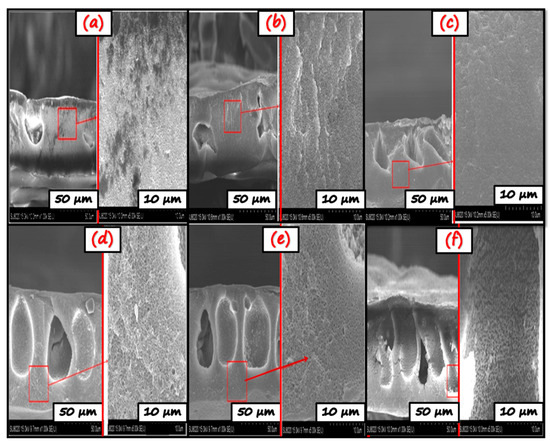 SEM cross-section morphology of (a) CA, (b) TiO2-CA, (c) GO-CA, (d) NC(1)-CA, (e) NC(2)-CA and, (f) NC(3)-CA.