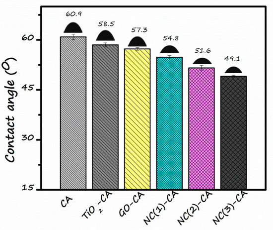 Wettability measurements of the membrane were assessed by water contact angle (WCA). WCA is determined by sessile drop method. Figure 9 depicts the contact angle of the bare CA membrane (60.9°) was highest, demonstrating its hydrophobic nature. Although TiO2 nanoparticles are hydrophilic, the GO-CA still showed more hydrophilic character. It might be credited to the unique sheet structure of GO possessing a large number of hydroxyl groups, which impart a more hydrophilic character to the membrane [60]. When GO/TiO2 nano-photocatalysts with different GO content is employed, the contact angle value decreases progressively. The contact angle of NC(1)-CA, NC(2)-CA, and NC(3)-CA membrane is 54.8°, 51.6°, and 49.1°, respectively. This supports the observation that the introduction of nanocomposite increases the hydrophilic property of membranes owing to the higher content of hydrophilic species, i.e., GO/TiO2. Therefore, the NC-3 membrane has the lowest water contact angle (49.1°), and is accordingly highly hydrophilic. The increased hydrophilicity of hybrid membrane is subjected to two reasons. Firstly, during the phase inversion process, the decrement in the interface energy resulting in the spontaneous travel of nano-photocatalysts towards the interface of membrane/water [61]. Secondly, since contact angle is calculated using the sessile drop technique, sunlight is also employed for a few seconds, which triggers the production of reactive oxygen species, viz. OH and radical anions are generated by excitation of photocatalysts by absorbing light [39]. It further reduces the contact angle value to its smaller extent due to the photo-induced hydrophilicity of GO/TiO2. Moreover, the modification of membrane with GO/TiO2 nanocomposites increases the anti-fouling property due to the generation of ROSs details, as discussed in later sections [62].