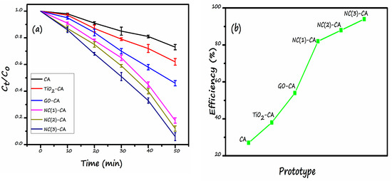 The photocatalytic behavior of various membranes was evaluated under a visible light source (Xe-lamp). Firstly, the solution was kept in darkness for almost 45 min to establish adsorption-desorption equilibrium. Afterward, the light was turned on. Pristine CA-membrane almost showed no photocatalytic activity. It implies that the bare CA-membrane is incapable of illustrating appropriate photocatalytic activity. On the contrary, supplementing the single photocatalyst (TiO2 and GO) or nanocomposite photocatalyst (GO/TiO2) to the membrane matrix resulted in the greater photocatalytic response under visible light (Figure 11a). The photodegradation activity of TiO2-CA and GO-CA membrane was also investigated under similar conditions. Figure 11b demonstrates the photocatalytic efficacy order: NC(3)-CA (98.1%) > NC(2)-CA (91.6%) > NC(1)-CA (85.4%) > GO-CA (57%) > TiO2-CA (37%) >Pristine CA (25%). The photocatalytic activity of GO-CA (81%) and TiO2-CA (73%) is almost similar. This is because both semiconductors have almost similar band gaps and issues of charge carrier recombination, limiting the applicability of any photocatalysts correlated with both of them. Higher efficiency of GO-CA than TiO2-CA could be related to the visible light active band gap of GO compared to TiO2, a UV active photocatalyst, thus poor efficiency. Results illustrate that NC(3)-CA posessed the highest photocatalytic response. The highest response of nanocomposite photocatalytic membrane is owing to the two reasons: (1) Synergistic effect of TiO2 and GO. The integration of GO and TiO2 shift the bandgap of TiO2 somewhat into the visible region, as confirmed by the DRS spectra (Figure 6a). Thus, it utilizes a wide range of the spectrum. (2) Poor charge carrier recombination: GO forms heterostructure with TiO2. This configuration lowers the recombination process of charge carrier and leads to the superior photocatalytic response. The detailed mechanism is discussed in a later section. These findings are well-consistent with already published reports. For instance, Gao et al. reported the superior photocatalytic response of GO/TiO2-PVDF membrane is due to the synergistic effect of GO and TiO2 [39,66]. The varied amount of GO has a significant effect on the photocatalytic efficiency of the membrane. NC(3)-CA showed the maximum response because of the lowest band gap value of GO/TiO2 NC (2.99 eV) incorporated in the respective membrane, as shown in Table 2. This results in a greater adsorption of MO molecule on GO surface, and more active visible light absorption results in a greater photocatalytic response [67].