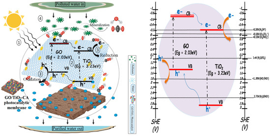 With the best literature survey, Zhang et al. [20] and Choi et al. [21] proposed the concept of photocatalytic membranes in 2006. In the report, the authors have functionally modified the ceramic membrane surface with the TiO2 based photocatalytic layer for water treatment. Due to this coupling process, the membrane surface prevents degraded organic contaminants from permeating through the membrane. Meanwhile, they mitigate membrane fouling due to the coherent decomposition of pollutants through photocatalysis. TiO2 can be affirmed as the archetypical photocatalyst, a suitable synonym for photocatalysis. Owing to inherent characteristics, including vigorous catalytic activity, high stability in the chemical or photochemical environment, a wide range of pH, relatively cheap cost, low toxicity, enhanced hydrophilicity, and suitable self-cleaning property, one can tailor the permeation performance of the membrane. It has been extensively utilized in the domain of photocatalytic membranes [14]. However, the UV active photocatalyst uses only 5% of the solar spectrum, rapid electron-hole recombination, and demonstrates a greater tendency for aggregation, which impedes its feasibility for practical application in photocatalytic membranes [22,23]. Several approaches have been considered so far, like the formation of heterojunctions with other semiconductors [24,25], doping (metal or non-metal), [26] heterostructure formation with carbon-based materials, including quantum dots (QDs), graphene oxide (GO) [27], and (rGO) [28] to conquer the significant concerns. Among them, GO has attracted considerable interest from the material researchers. The desirable properties in the membrane filtration and photocatalysis domain mainly include superior hydrophilicity, good dispersion in the polymer matrix, high surface area, and excellent electron acceptor and donor capability, thereby showing excellent photocatalytic responses [29,30,31]. Coupling GO and TiO2 is considered the practical way to tailor the shortcomings associated with TiO2 [32,33,34,35]. Extensive research towards supplementing the GO/TiO2 nano-composites on membrane surfaces has been reported to endow membranes with desired characters [36,37,38,39,40,41]. Recently, authors reported the modification of polyethersulfone (PES) membrane surface with GO/TiO2 nano-composites with enhanced water purification [42,43]. The PVDF membrane surface [44] and CA membrane surface [36] have also been modified with graphene/titania nano-composite employment, suggesting great potential for water treatment. Nonetheless, membrane surface modification methodology has some drawbacks, mainly the loss of particles from the membrane when subjected to long filtration operation [45].