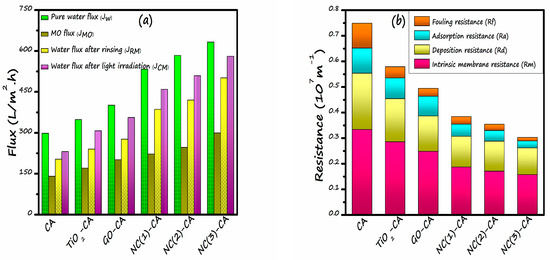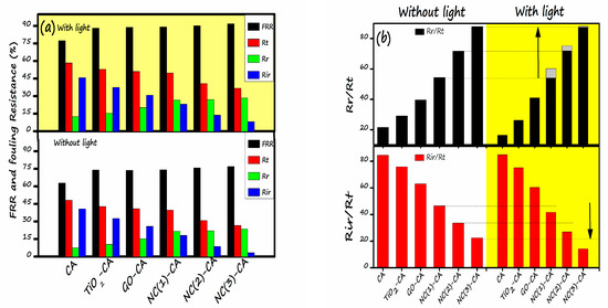 To further observe the fouling of membrane, two essential parameters viz. Flux recovery ratio (FRR), Fouling ratio (Fr) was calculated by employing Equations (12) and (13) respectively are presented in Figure 14. More often than not, a more excellent FRR value represents a superior anti-fouling property of membrane. The FRR value for all the membranes supplemented with NC(1)-CA, NC(2)-CA, and NC(3)-CA is higher than the bare CA, GO-CA, or TiO2-CA membranes, representing the enhanced anti-fouling performance of nanocomposite employed membranes. Without light, the FRR value of the bare CA membrane is 62.98%, lowest amongst all other membranes, indicating poor anti-fouling capability. In contrast, the highest FRR (76.99%) was noticed for NC(3)-CA. This might be ascribed to the improvement in hydrophilicity of the membrane. When light is turned on, an amelioration in the anti-fouling behavior was noticed for all the membranes. The increment in the FRR value is due to the photocatalytic degradation of MO under the light. In the best-case scenario, the FRR value for NC(3)-CA membrane was increased from 76.99% to 91.78%. The increment in the FRR value with light justifies the self-cleaning ability of the membrane, implying good agreement with the findings of reference [45,74]. Moreover, the fouling ratio (Rt) (reversible fouling (Rr) + irreversible fouling (Rir)) of all the membranes followed the sequence CA > TiO2-CA > GO-CA > NC(1)-CA > NC(2)-CA > NC(3)-CA. The result demonstrates that the fouling ratio of nanocomposite membrane is the lowest. Moreover, results signify that the improvement in hydrophilicity, the introduction of the nanocomposite, and the light source are critical factors determining the membranes’ enhanced anti-fouling ability. In depth analysis reveals that the occurrence of membrane fouling might be due to the contribution reversible resistance and irreversible resistance. The reversible resistance takes place owing to the dye molecule adsorption on membrane surface. Figure 14b demonstrates the reversible fouling to total fouling percentage (Rr/Rt) and irreversible to total fouling percentage (Rir/Rt) of all the photocatalytic membranes. The reversible fouling to total fouling percentage (Rr/Rt) was increased for hybrid membranes in the presence of light. On the contrary, irreversible to total fouling percentage (Rir/Rt) of the hybrid membranes decreased in the presence of light compared to the membranes without light. The overall membrane fouling for the hybrid membranes is dominated by irreversible to total fouling percentage (Rir/Rt), and could be mitigated with light due to the photocatalytic degradation of dye molecules. Generally, hybrid membranes showed enhanced antifouling photocatalytic performance. Therefore, the NC(3)-CA membrane outperforms the antifouling field.
