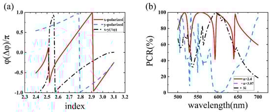 As shown in Figure 4a, for the BTO nanofins, the phase shift of the linearly polarized beam along the ordinary axes (x-polarized) and the extraordinary axes (y-polarized) and the phase shift difference between the output light of the two beams changed with the refractive index as depicted. The results showed that when the refractive index of the BTO layer was 2.4 (no applied voltage), the phase shift difference was π. During the period of increasing the refractive index to 3.07, the phase shift difference could cover all values from 0 − π, and become 0 when n = 3.07. In order to further show that the optimization results met the design requirements, the polarization conversion efficiency (PCR) of the BTO nanofins (n = 2.4 and 3.07) and the Si nanofins from 500 nm to 700 nm are depicted in Figure 4b. The results showed that the PCR of the BTO nanofins can reach 98.4% (n = 2.4) and 0.3% (n = 3.07) when the wavelength was 600 nm. Therefore, the resultant parameters can fit the desired functions well.