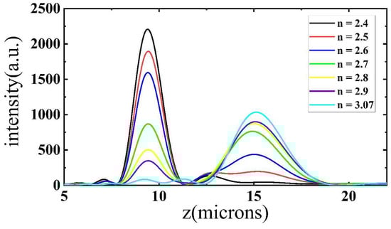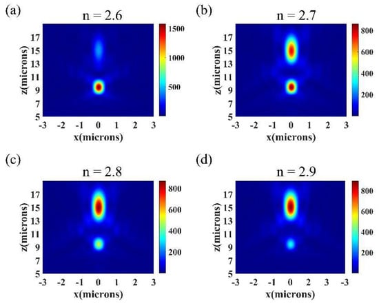 In order to demonstrate that the intensity ratio between the two focal points of the designed metalens can be modulated, the refractive index of BTO was set as 2.6, 2.7, 2.8 and 2.9 (with applied voltages of 18 V, 27 V, 36 V and 45 V). In Figure 6, the intensity distributions of the simulated results are shown. Combined with Figure 5a,d, the results showed that when the refractive index of BTO gradually increased, the intensity of the first focal point (with focal length f1 = 9 μm) would gradually decrease until the focal point disappeared. Additionally, the intensity of the second focal point (with focal length f2 = 15 μm) showed a trend of a gradual increase.