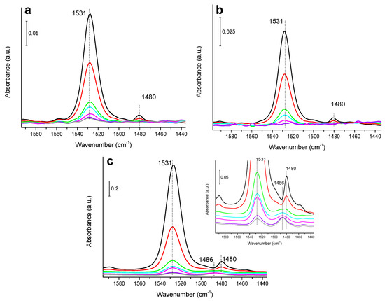 IR spectra of nitrobenzene adsorption on: (a) Cu/SiO2, (b) Pd/SiO2 and (c) Ni/SiO2 (in the inset a zoom of the bottom part of the IR spectra), and their evolution with the temperature: 25 °C (black), 60 °C (red), 120 °C (green), 140 °C (cyan), 160 °C (magenta), 180 °C (violet) and 200 °C (grey).