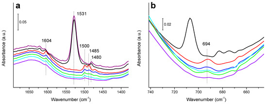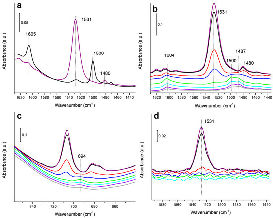 First, samples were submitted to activation at 240 °C in H2 flow (10 mL·min−1) for 1.5 h and then evacuated under dynamic vacuum of 10−5 mbar at 290 °C for 1 h. Next, the temperature in the cell was decreased to room temperature prior to reactants dosing. Samples were studied in terms of nitrobenzene adsorption and its reactivity with H2. In the first case, nitrobenzene was dosed at room temperature until saturation (~0.3 mbar, i.e., 3.68 × 10−6 mol) while, in the second one, after nitrobenzene adsorption at room temperature, samples were evacuated; then, H2 (~12 mbar, i.e., 147 × 10−6 mol) was introduced to the cell. After nitrobenzene or nitrobenzene/H2 dosing, the temperature of the cell was increased to 60, 90, 120, 140, 160, 180 and 200 °C, and the evolution of the formed species followed at each temperature, acquiring the IR spectrum after 20 min.