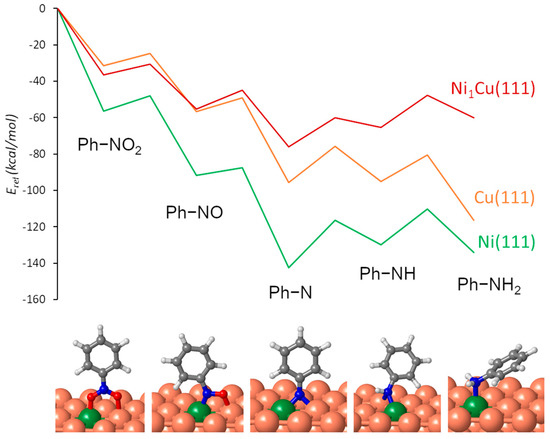 - Mahata, A.; Rai, R.K.; Choudhuri, I.; Singh, S.K.; Pathak, B. Direct vs. Indirect Pathway for Nitrobenzene Reduction Reaction on a Ni Catalyst Surface: A Density Functional Study. Phys. Chem. Chem. Phys. 2014, 16, 26365–26374. [Google Scholar] [CrossRef]