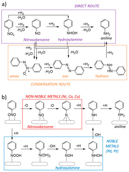 (a) Direct (purple) and condensation (orange) routes of the mechanism proposed by Haber for hydrogenation of nitrobenzene. (b) Possible pathways for the direct route of the mechanism on non-noble metals (red) and noble metals (blue).