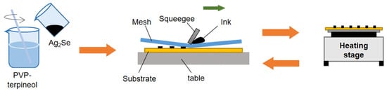 A certain amount of PVP was dispersed and dissolved in 0.4 g terpineol, and 0.5 g Ag2Se was dispersed in the above solution under sufficient stirring. The polyimide (PI) substrate was ultrasonically cleaned to ensure its surface was free of impurities. After the above mixture was screen-printed on PI substrate with a 200 mesh screen, it was heated and cured at a constant temperature for 10 min to remove the terpineol in a nitrogen environment. The screen printing and sintering process was repeated three times until the mixture was used up. The effect of PVP content on the performance of films was investigated by adjusting the PVP content to determine the content ratio of Ag2Se to PVP as 10:1, 20:1, and 30:1, and naming them PI10, PI20, and PI30, respectively. The films consisted of 6 strips, each with a length of 40 mm × 5 mm and a spacing of 10 mm. The F-TEGs used conductive silver adhesive to connect the legs to reduce additional resistance. The manufacturing process and assisted sintering of the Ag2Se/PVP film using low-cost screen printing are shown in Figure 1.