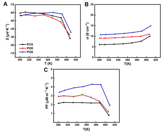 Temperature dependence for (A) Seebeck coefficient, (B) electrical conductivity, (C) power factor of the PI10, PI20, and PI30.