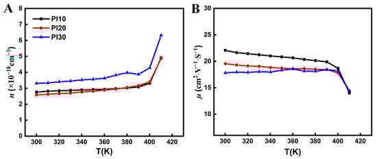 Temperature dependence for (A) carrier concentration; (B) mobility of PI10, PI20, and PI30.